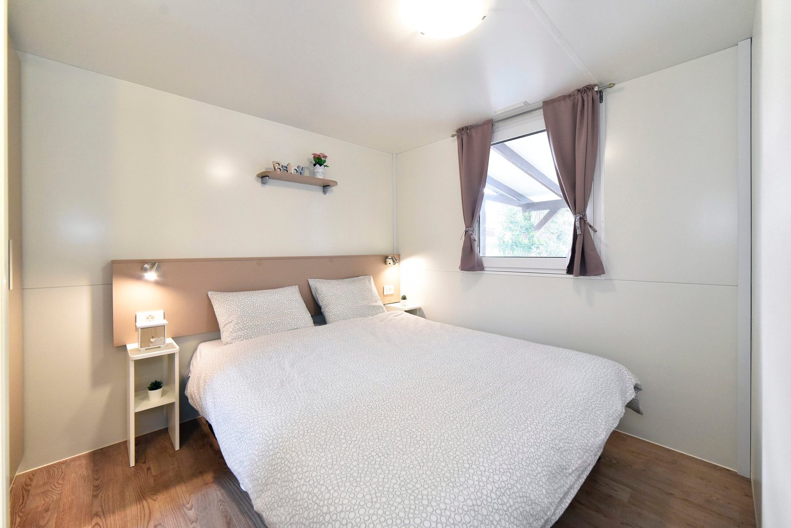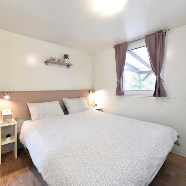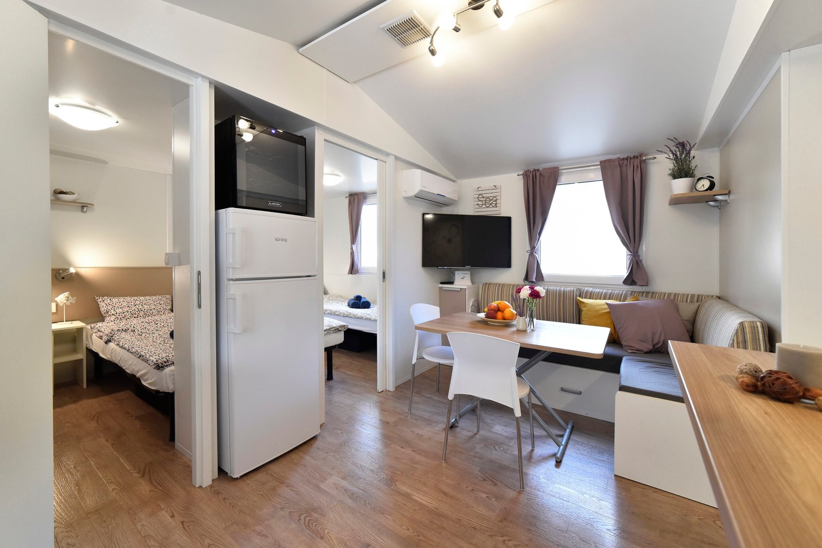 Das Mobilheim ist so durchdacht gestaltet, dass Sie in den Schlafzimmern Privatsphäre haben, während der gemeinsame Bereich offen und angenehm für gesellige Stunden ist, mit einer zusätzlichen Schlafmöglichkeit auf dem ausziehbaren Sofa.