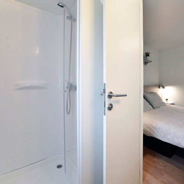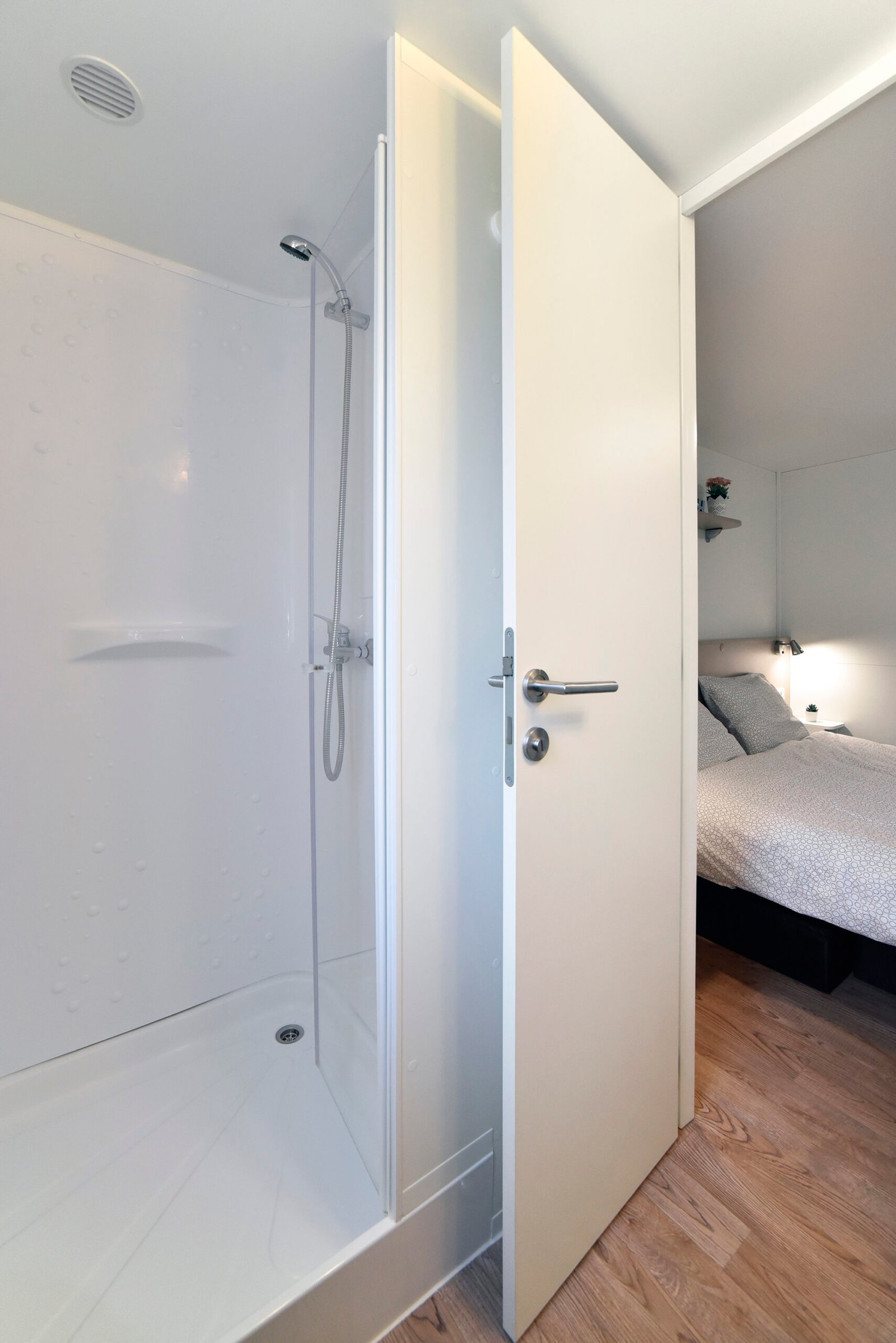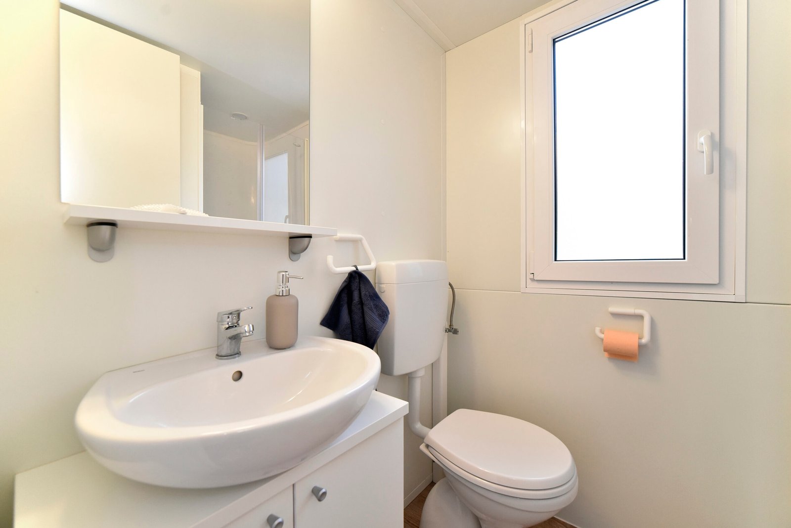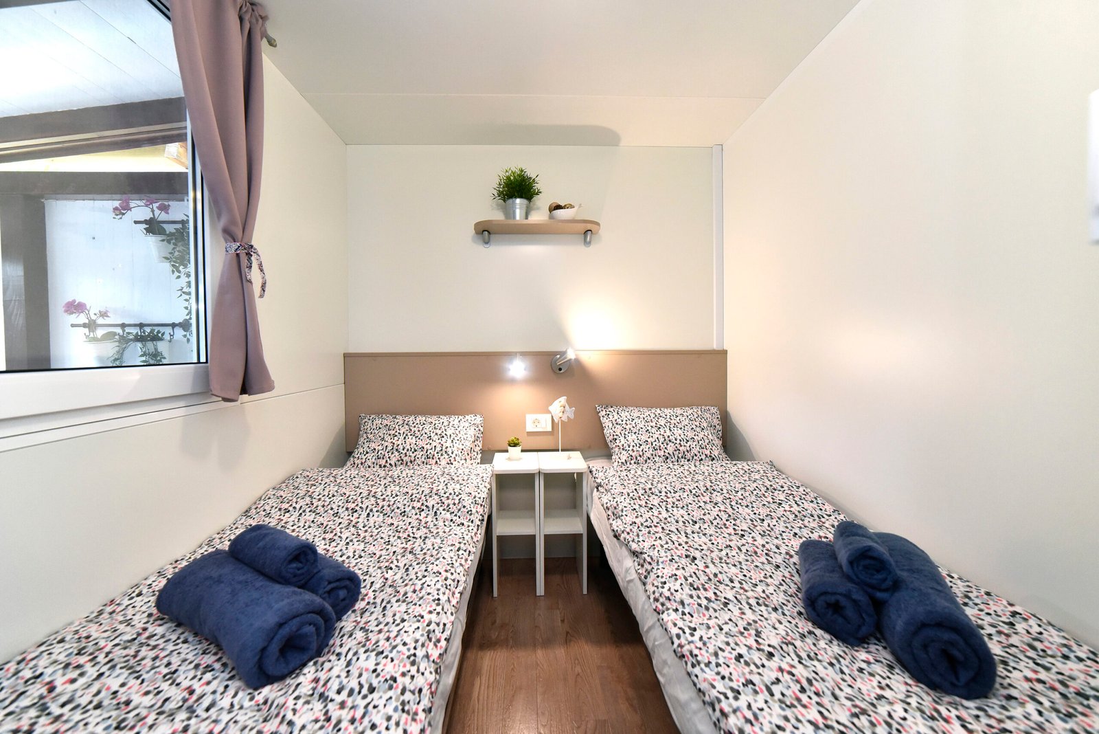 Das Mobilheim ist so durchdacht gestaltet, dass Sie in den Schlafzimmern Privatsphäre haben, während der gemeinsame Bereich offen und angenehm für gesellige Stunden ist, mit einer zusätzlichen Schlafmöglichkeit auf dem ausziehbaren Sofa.