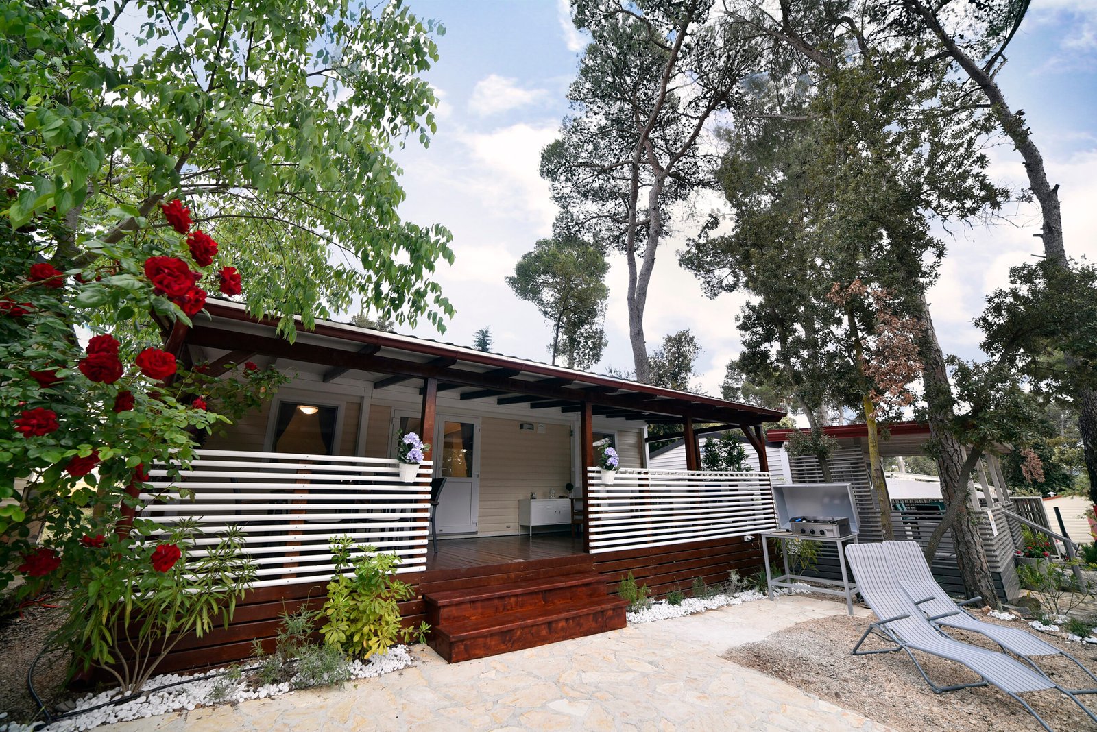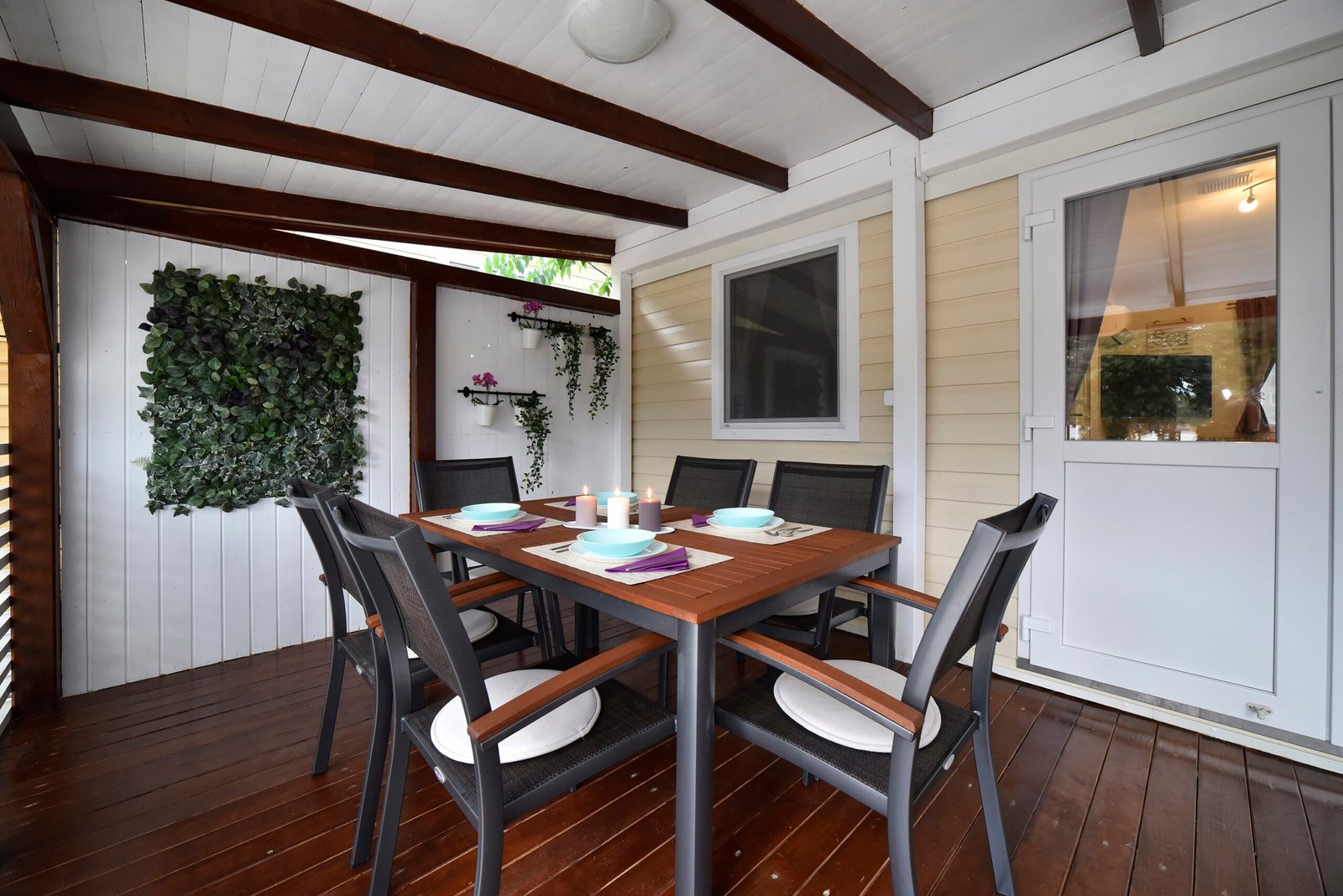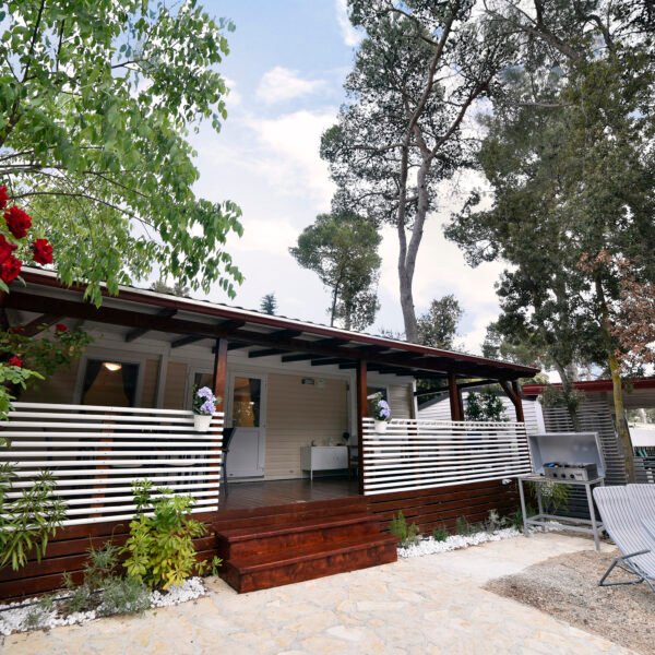 Die überdachte Terrasse ist eine Verlängerung des Wohnbereichs und der Ort, an dem Sie am leichtesten in den „Sommermodus“ wechseln. Im Schatten der Pinien genießen Sie Ihren Morgenkaffee, das Mittagessen an der frischen Luft oder entspannte Stunden am Abend, mit viel Platz zum Zusammensitzen. Der Grill ist ideal für einfache Abendessen im Freien, während das Grün rund um das Mobilheim Privatsphäre und dieses ruhige Gefühl von Natur vermittelt – obwohl Sie nur wenige Minuten vom Meer entfernt sind.
