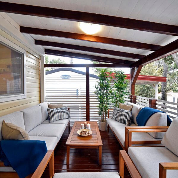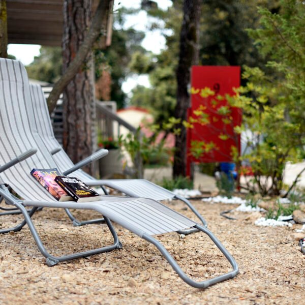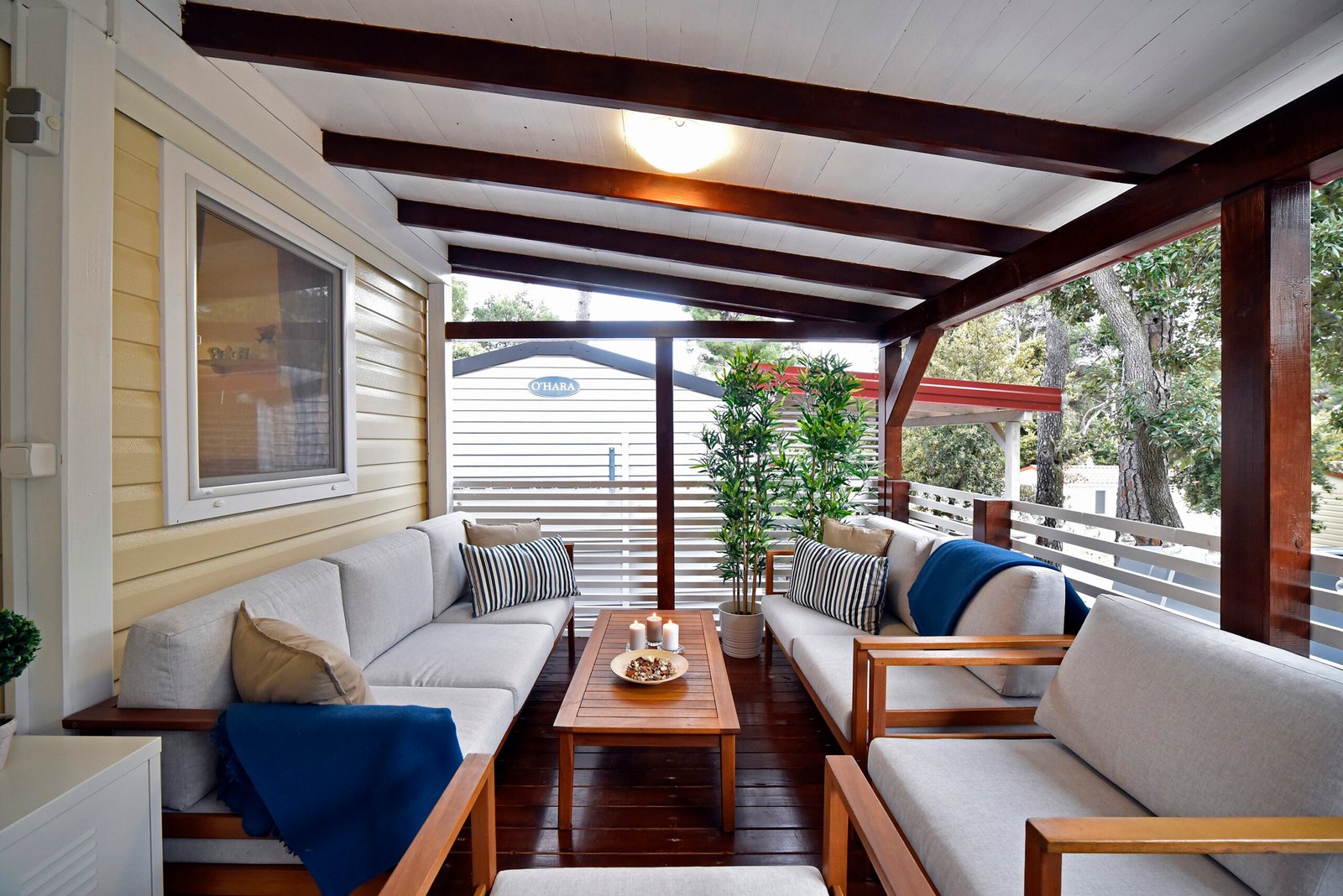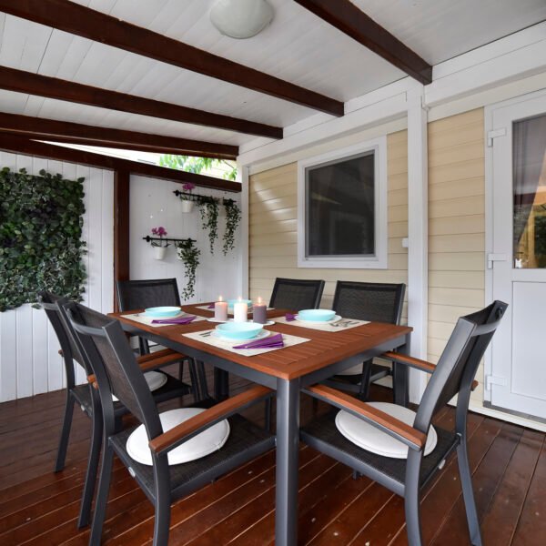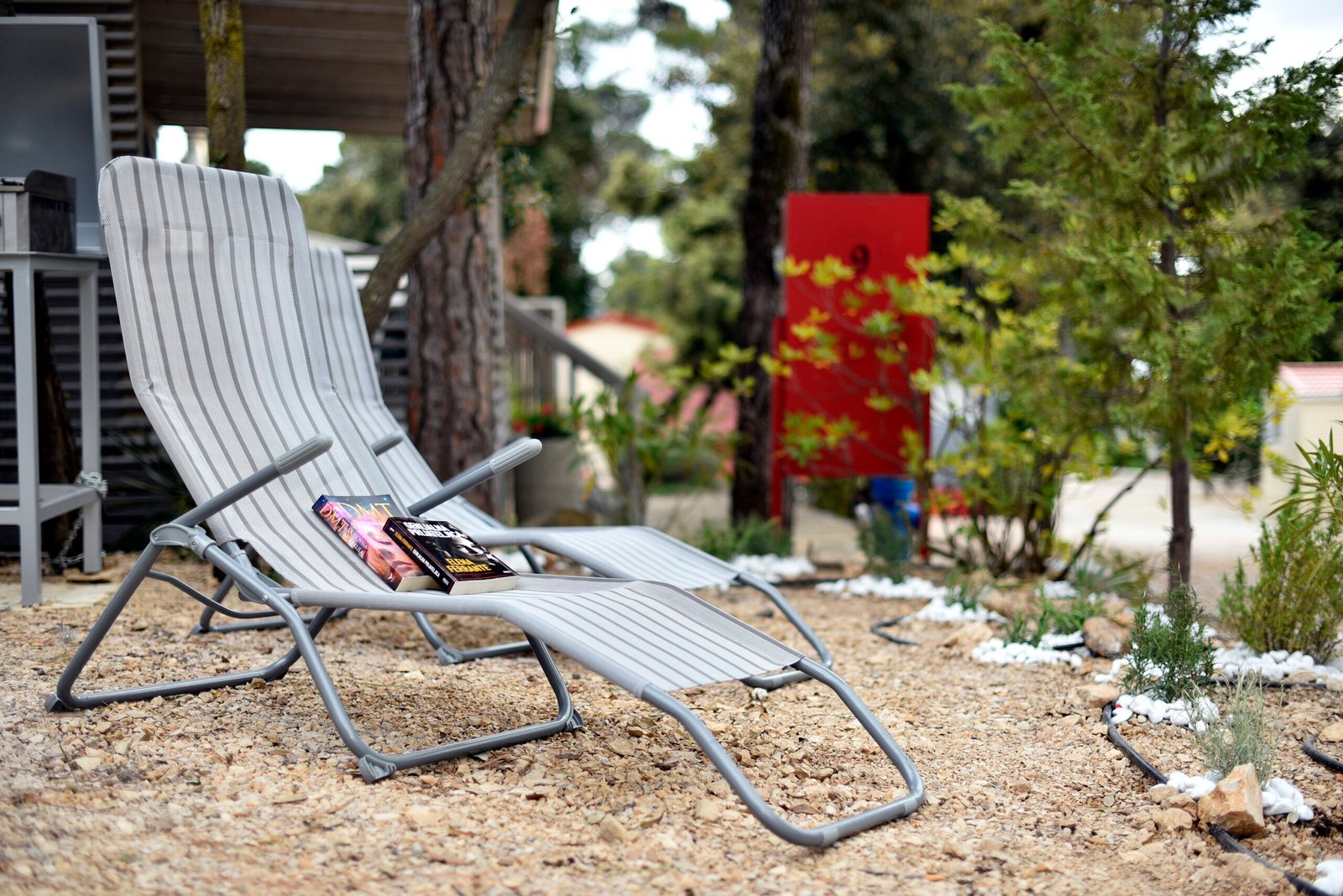 Die überdachte Terrasse ist eine Verlängerung des Wohnbereichs und der Ort, an dem Sie am leichtesten in den „Sommermodus“ wechseln. Im Schatten der Pinien genießen Sie Ihren Morgenkaffee, das Mittagessen an der frischen Luft oder entspannte Stunden am Abend, mit viel Platz zum Zusammensitzen. Der Grill ist ideal für einfache Abendessen im Freien, während das Grün rund um das Mobilheim Privatsphäre und dieses ruhige Gefühl von Natur vermittelt – obwohl Sie nur wenige Minuten vom Meer entfernt sind.